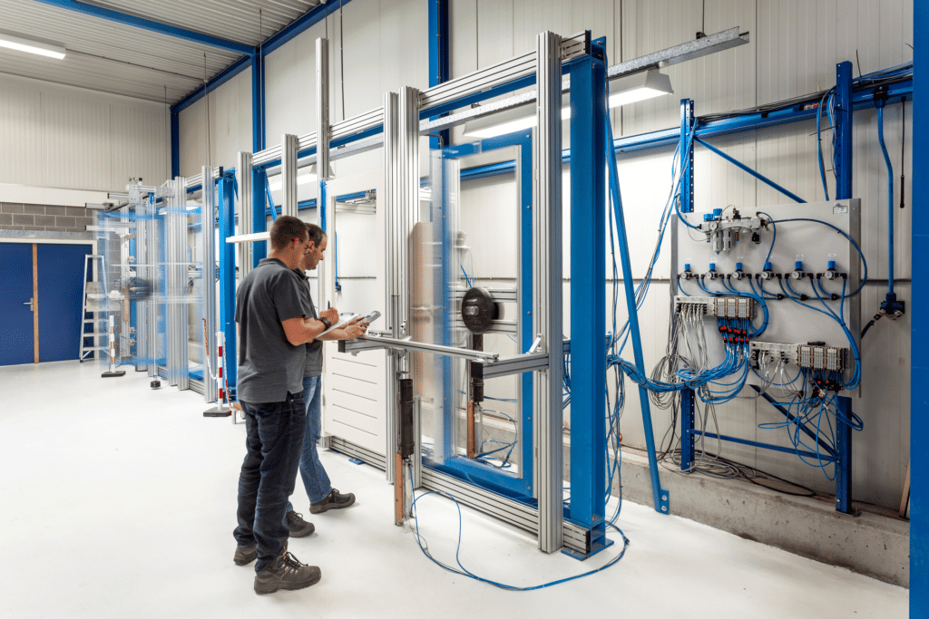 “We controleren bouwproducten op wettelijke regels en aanvullende normen waar bedrijven zich mee kunnen onderscheiden”, vertelt Ton van Beek, Technisch Manager bij SKG-IKOB, bij binnenkomst. “Ons werk is onafhankelijk. Wat wij hier meten, bepaalt of iets veilig de markt op mag.” Hij leidt ons met veel enthousiasme rond door het testlaboratorium tussen imposante testopstellingen. “Veel mensen realiseren zich niet dat iets simpels als een slot duizenden bewegingscycli moet doorstaan”, zegt hij terwijl hij een cilindertester demonstreert. Een metalen arm beweegt onophoudelijk een sleutel in en uit een cilinder. Honderdduizend keer, om precies te zijn. Daarna volgt een controle: werkt het slot nog steeds zoals het hoort? In een andere hoek staat een opstelling die deurbewegingen simuleert. Een deur wordt met constante kracht open en dicht geslagen, wel tweehonderdduizend keer. “Dit is de praktijk nagebootst, maar in extreme vorm”, legt Van Beek uit.