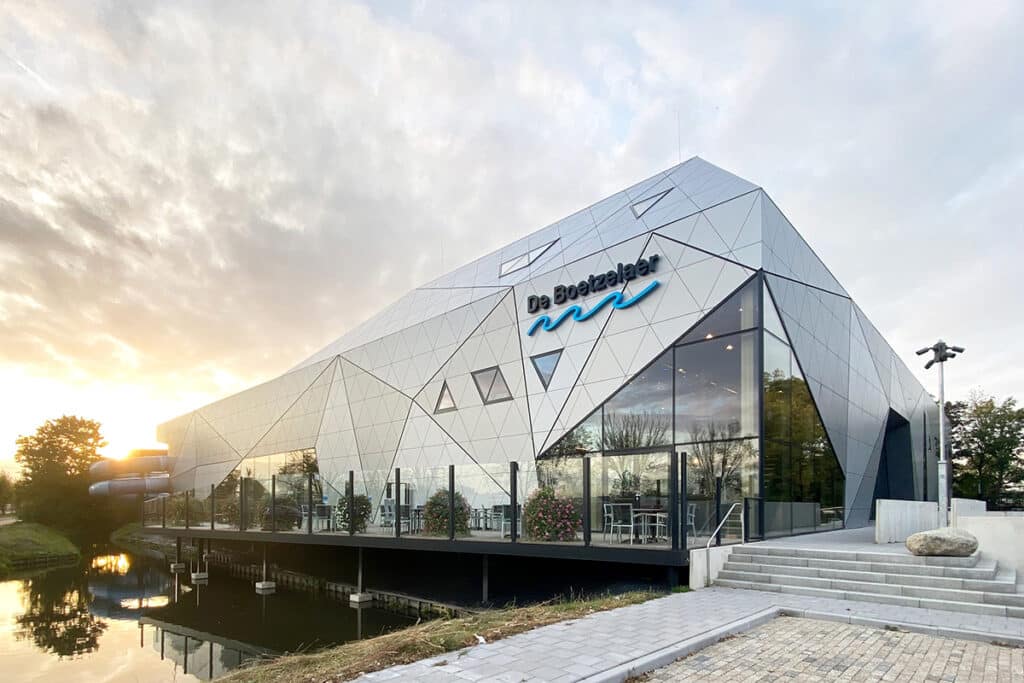 Een goed voorbeeld daarvan is het project De Boetzelaer in Monster. Nadat het regionale zwembad in 2019 door brand werd verwoest, kreeg het team van Bas1s Architecten de opdracht om in korte tijd een nieuw, iconisch gebouw te realiseren. “Het concept werd ‘rots in de branding’: een krachtig, herkenbaar symbool dat letterlijk en figuurlijk houvast biedt”, vertelt Siu Kin Shek, oprichter en eigenaar van Bas1s Architecten. In samenwerking met Trespa werd een gevel ontworpen die door slim gebruik van één type plaat in verschillende richtingen een driedimensionaal effect creëert. Wie langs het gebouw loopt, ervaart telkens een ander uiterlijk: een spel van licht, diepte en materiaal.